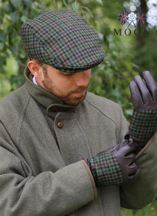 A classic flat cap made from 100% wool Abraham Moon dogtooth tweed.