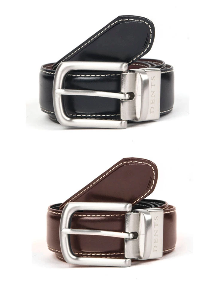 A classic, coated leather belt detailed with contrast stitching and finished with a reversible buckle.