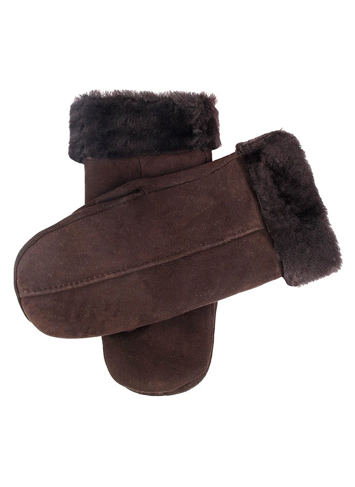 Delight your hands with one of our warmest styles for men â our sheepskin mittens. Mittens are naturally warmer than gloves, the fingers share a single space and so more easily share their heat, and being made from finest sheepskin, these mittens offer superior cosiness. The sheepskin doesnât even require an extra lining, the natural wool provides all the warmth needed making these mittens perfect for the coldest winter conditions. The sheepskin has a stylish sueded finish and there is a turned back cuff for a neat detail. Choose between versatile brown or black and start enjoying warm hands during cold days.