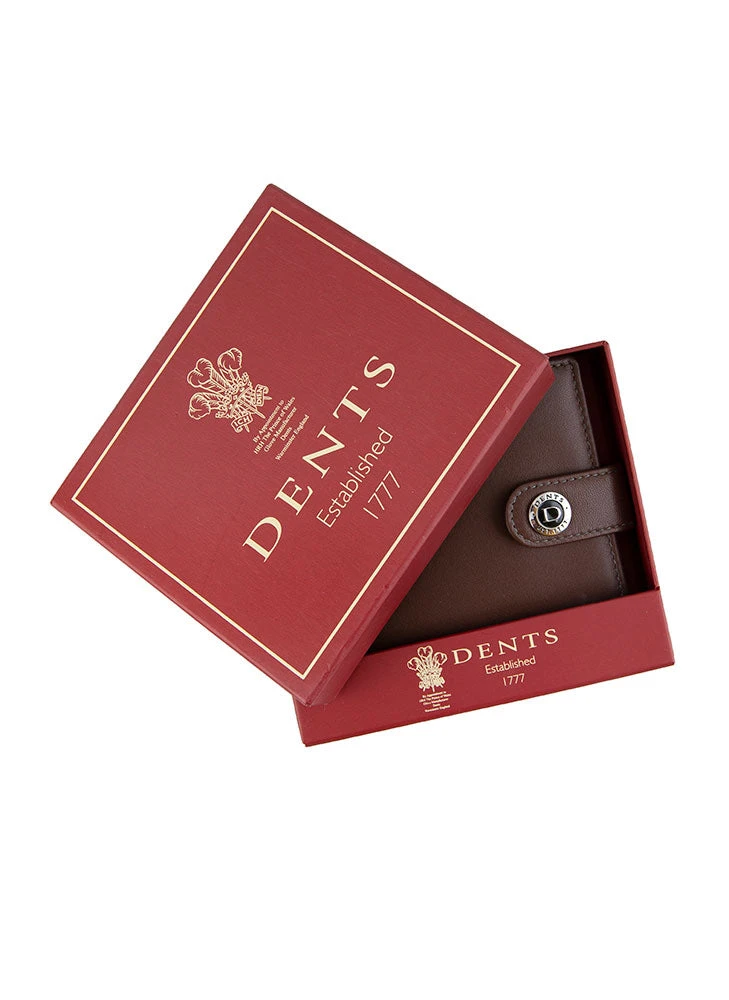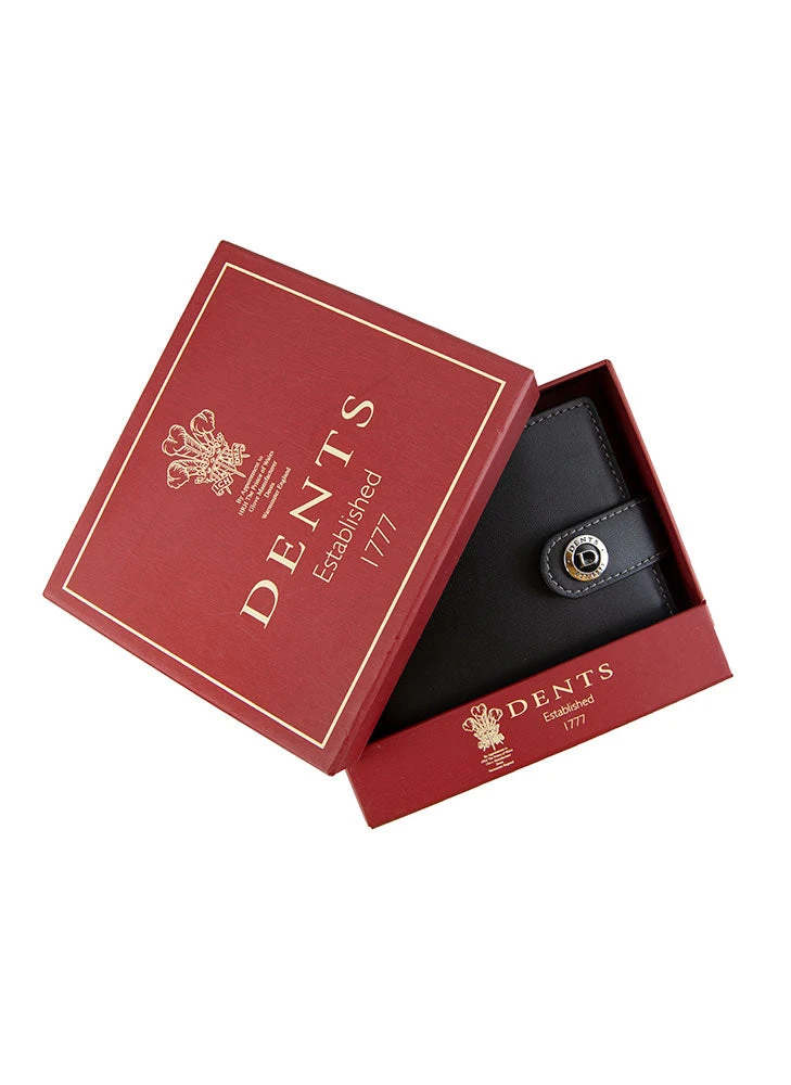 - Tab with shiny silver pressed stud clasps the wallet together for a compact shape