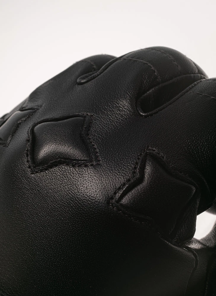 - Padded cross-shaped knuckles and stitch detailing on fingers offer a modern edge