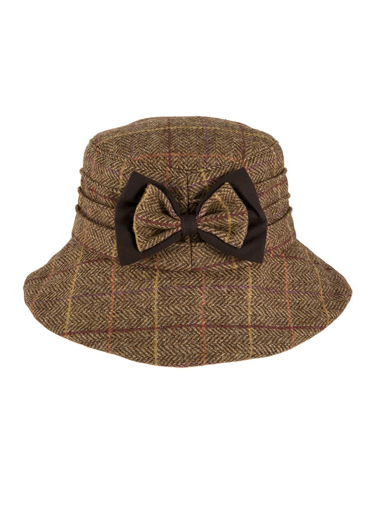 A classic tweed hat finished with a feminine bow, perfect for countryside attire.
