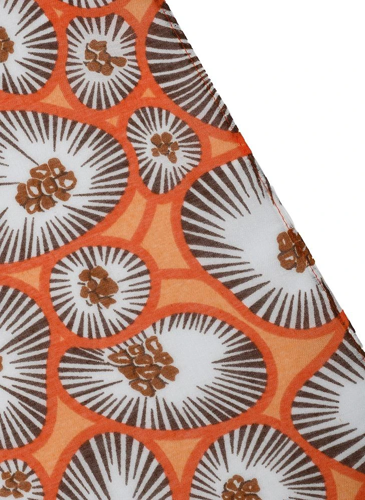 Dial up the drama this spring with our vibrant circle print scarf. The eye-catching pattern features abstract circles squashed together in a design that combines retro chic with modern attitude, creating something unique and intriguing. This unusual fashion fusion is offered in pumpkin orange and is finished with block colour ends, creating a true statement piece for your summer wardrobe.