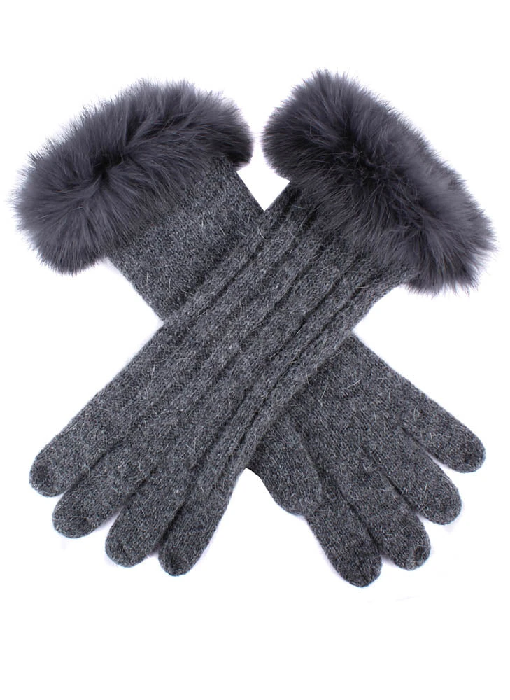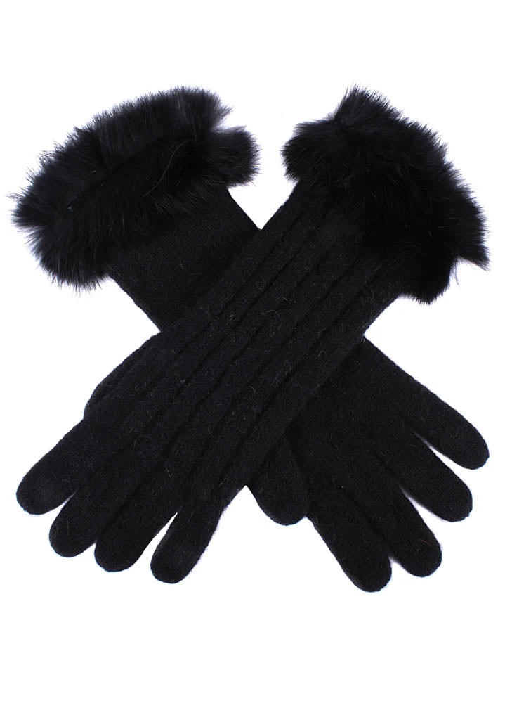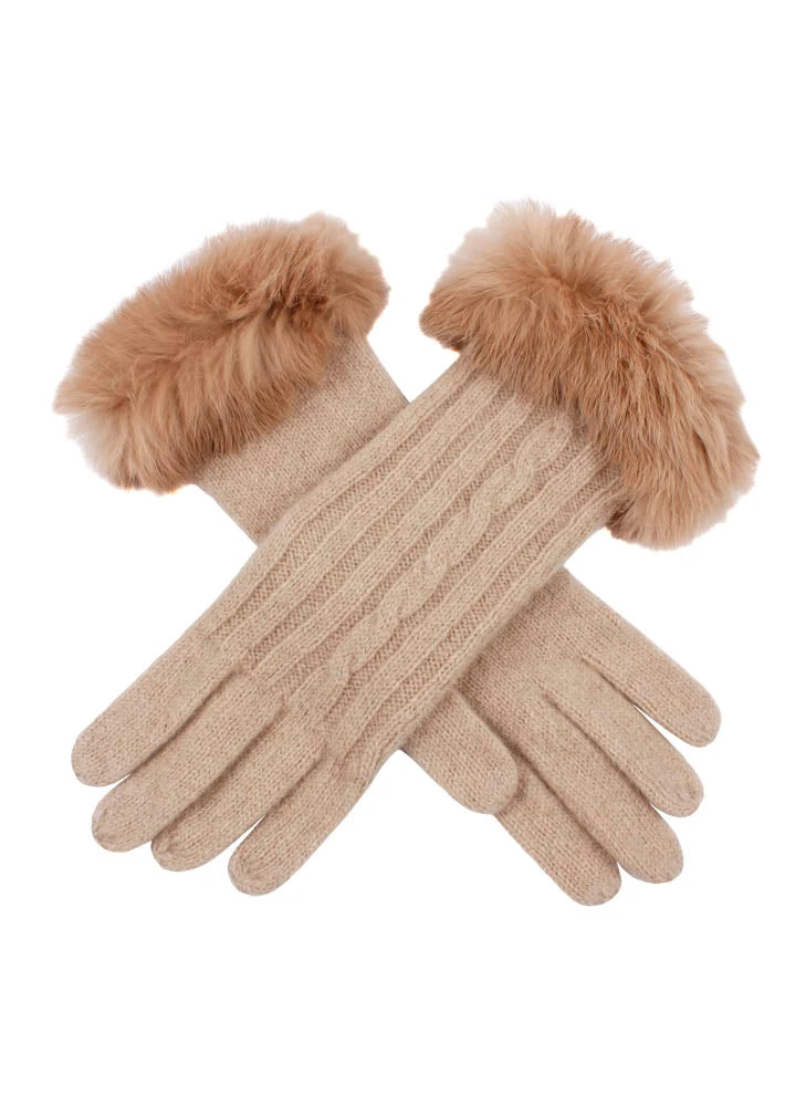 Finely knitted gloves showcasing silky soft rabbit fur cuffs a classic cable knit design.