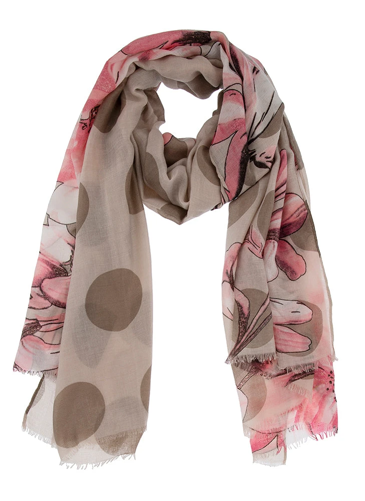 This soft scarf combines two of our favourite prints, spots and floral! Combined with a beautiful colour palette for an easy to wear piece for day-to-day wear.
