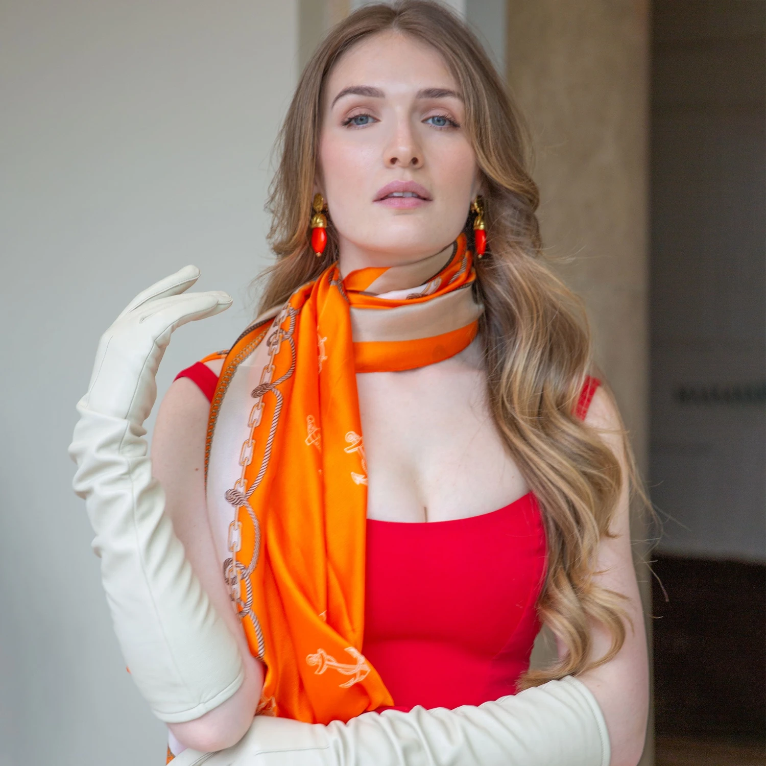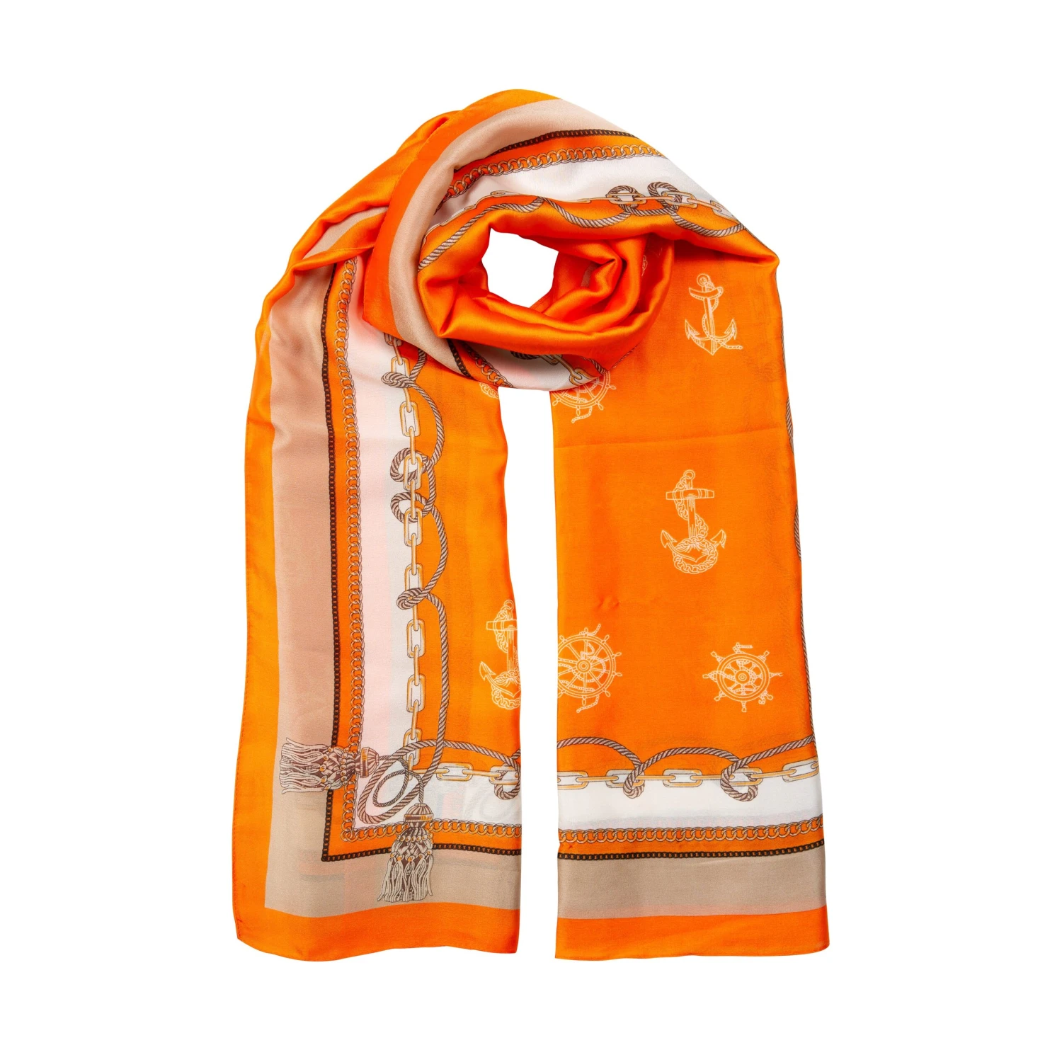 Take the helm and head off for a maritime adventure with our nautical print summer scarf. This charming accessory boasts a design inspired by the sea, featuring a subtle pattern of classic anchors and ship’s wheels. This is framed by chain and rope borders, adding the perfect finishing touches to this sophisticated scarf. Crafted from a silk-like fabric for elegant draping and easy styling, this lightweight scarf is available in pink or orange to add colour and timeless elegance to your warm weather wardrobe. A memorable scarf certain to rock your boat!