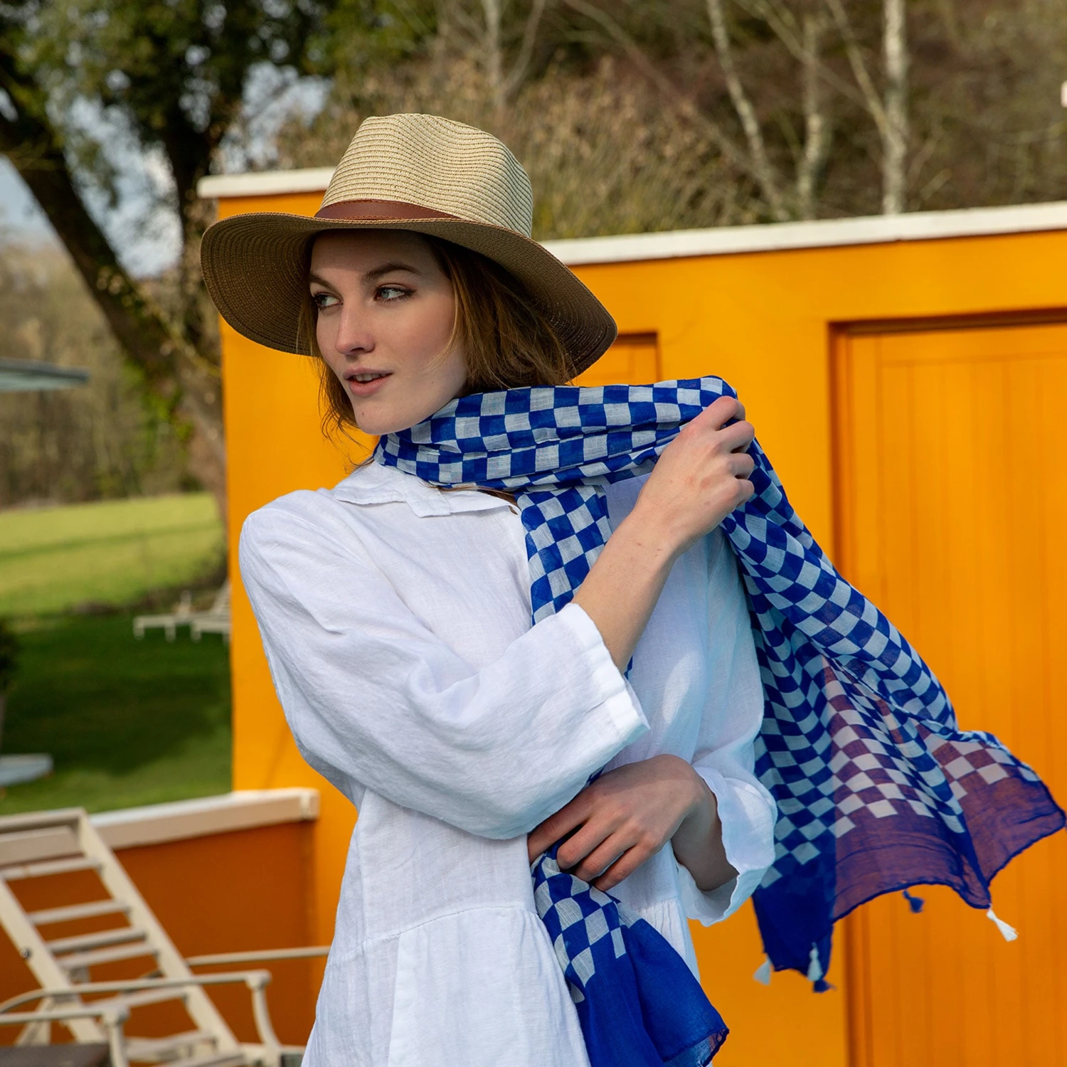 Cheer up your spring wardrobe with our checkerboard print scarf. Checkerboard is an extremely easy-to-wear check pattern, its simplicity and clean lines making it one of the hottest catwalk trends in recent years. And so we’ve designed a lightweight summer scarf complete with this popular pattern in two vibrant colours – pink or blue with white checks. The scarf is finished with colour block ends and fun knot tassels in the two colours. Ideal for layering during the change of seasons, this scarf is a versatile favourite in the making.