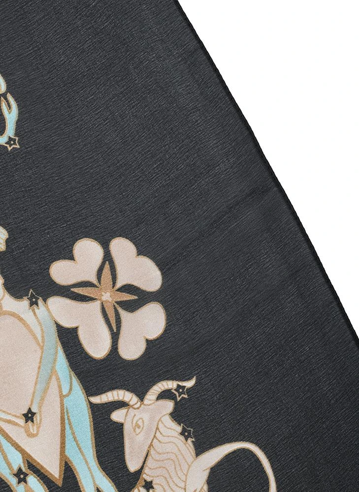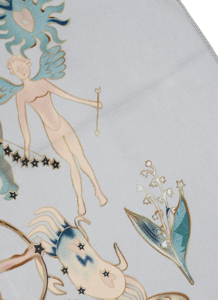 Add a touch of whimsy to your wardrobe with our zodiac print scarf. Inspired by the twelve signs of the zodiac, the unusual design includes visual motifs of the astrological signs finished with small stars. The look evokes a hand-painted illustration and is made all the more elegant thanks to the shimmery, silk-like fabric. Choose from two refined colours for the perfect finishing touch to your spring look.